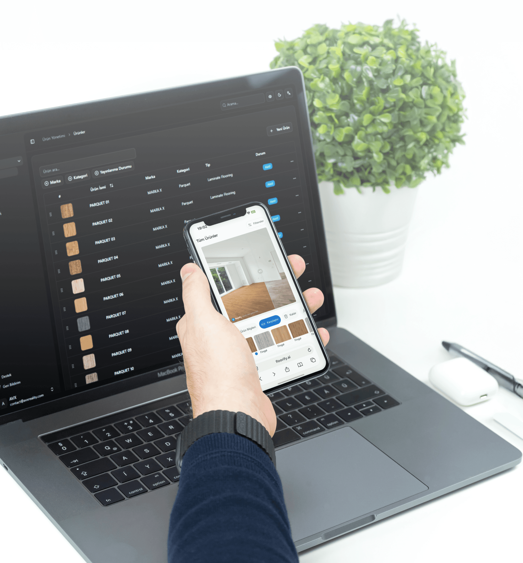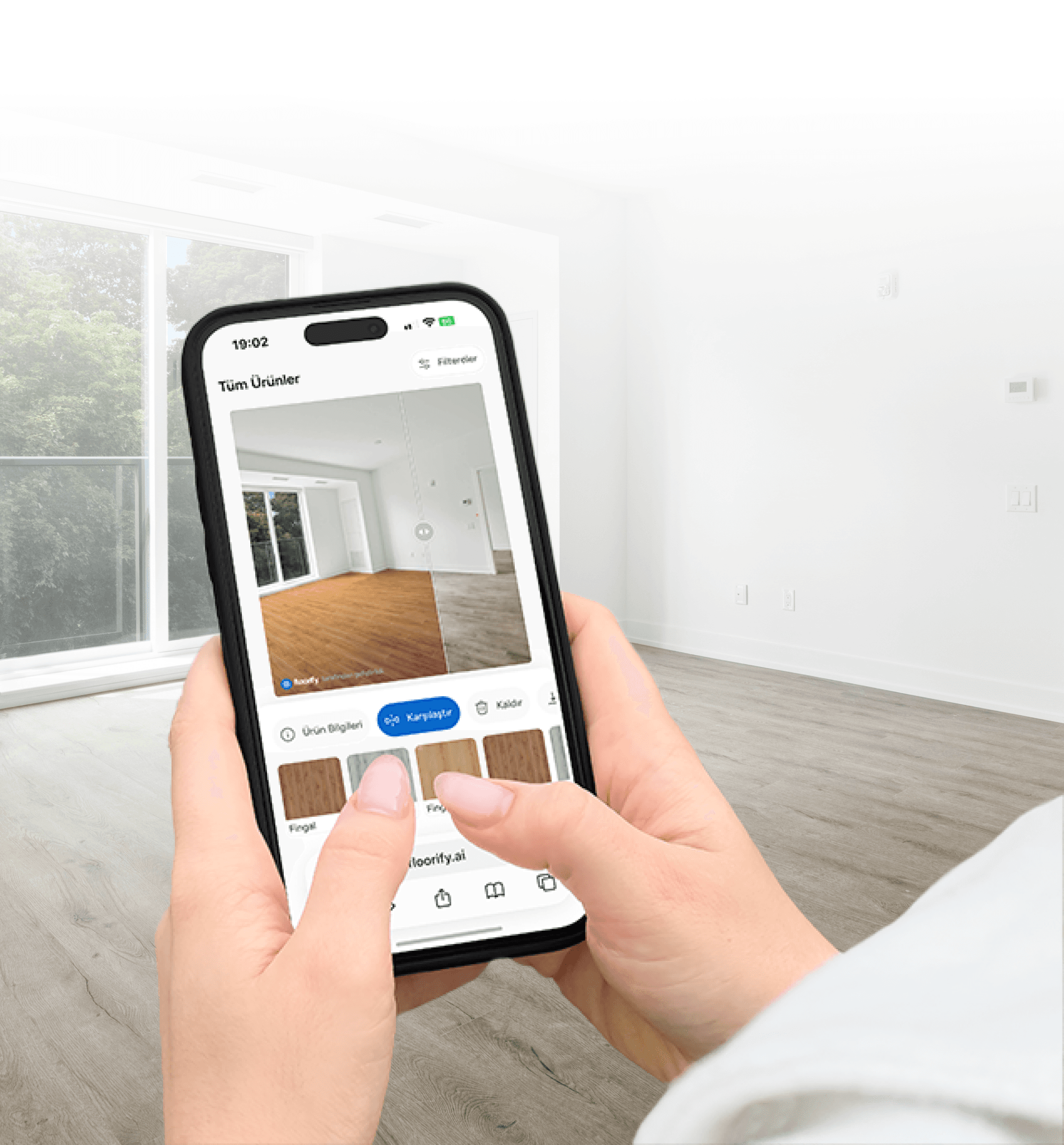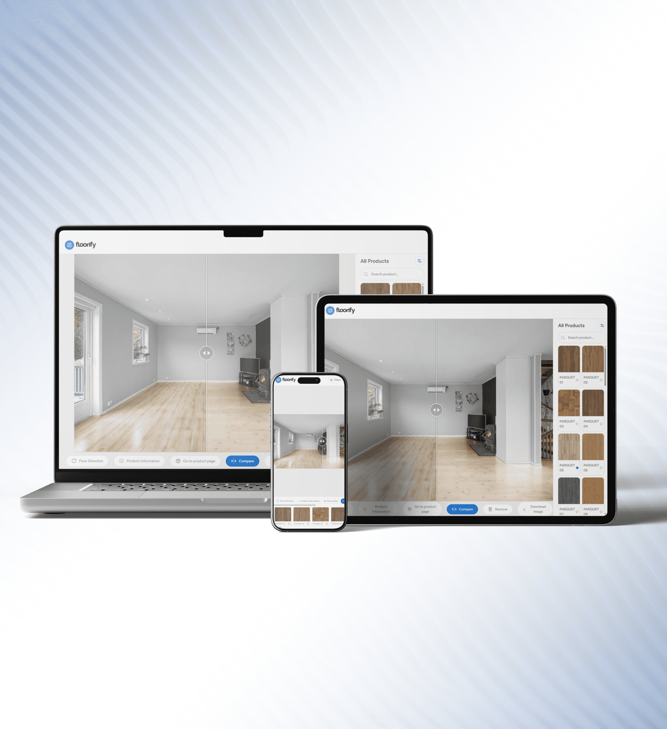 The product is saved and added to the site. When a customer uploads a photo of their home or office, Floorify automatically detects the existing floor and installs the brand’s product in its place.