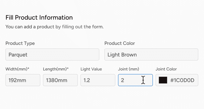 The brand fills in product type, dimensions, light value, joint size and joint color. These parameters are used to position the floor at the correct ratio and realism.