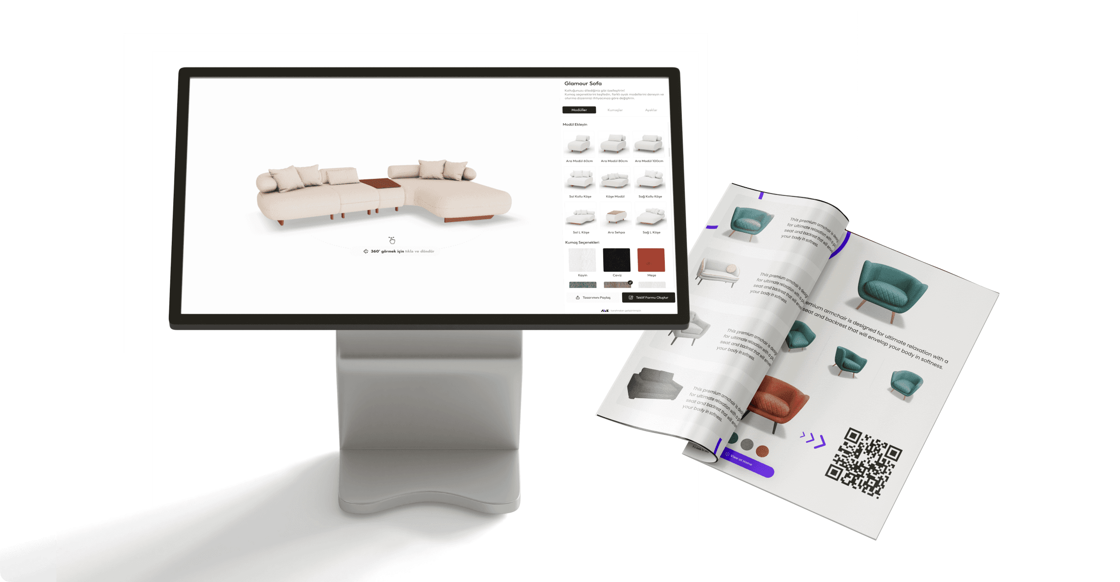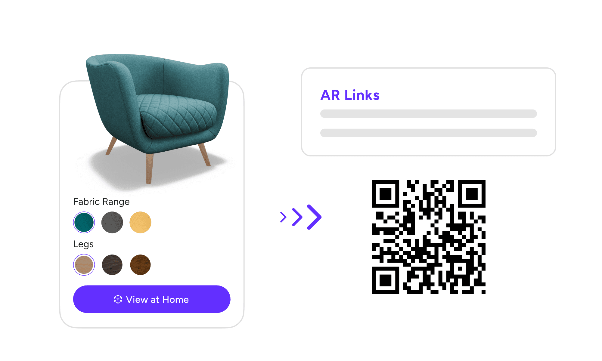 Every product receives a: • Configurator URL • 3D Viewer URL • AR Quick Look link • QR code for offline or showroom use