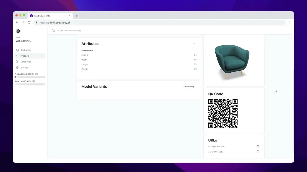 SeeTryBuy is a full scale 3D visualization, AR experience and visual CPQ platform built for brands that sell customizable, modular or high value products. Brands upload their 3D assets, enter product details in a self service panel and instantly receive 3D viewer links, AR links and QR codes ready for any channel.
